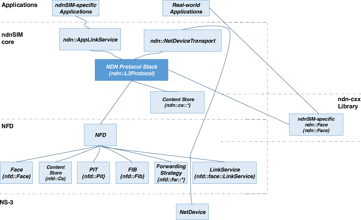 - ndnSIM uses implementation of basic NDN primitives from ndn-cxx library (NDN C++ library with eXperimental eXtensions)